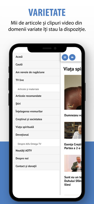 Descărcați aplicația din Apple AppStore (iPhone/iPad) sau Google Play (telefon/tabletă Android) și veți avea acces la canalul AOTV live 24/7, la programul TV și recomandări de emisiuni, veți putea urmări mii de clipuri video variate, știri, articole inspiraționale, devoționale, rugăciune și multe altele, disponibile acum în palma dvs!