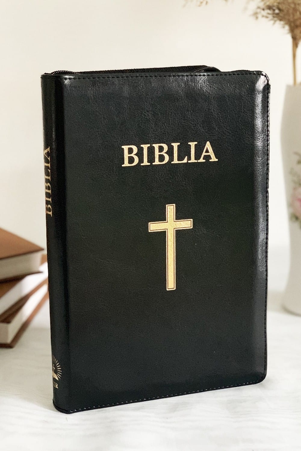 Biblie mare, piele și fermoar, marginii aurii și index.